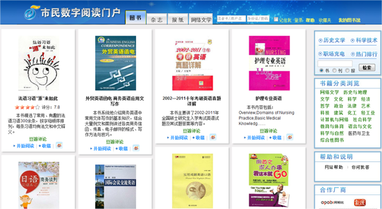 在上海圖書館建館60周年之際,上海圖書館推出“上海市民數(shù)字閱讀推廣計劃”,2012年主題是“館藏數(shù)字資源介紹及新技術體驗互動”。據(jù)介紹,該閱讀平臺為上海市民數(shù)字閱讀的統(tǒng)一入口,讀者證登錄一次即可使用網站的所有資源,不分卡的功能權限。資源上包括50萬冊方正電子書、400余種方正數(shù)字報、1000余種時尚期刊及多種多媒體館藏精品,并且資源會在首頁上動態(tài)滾動呈現(xiàn)。