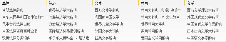 主要收錄國內各大出版社各個領域的權威工具書,目前已經收錄了《中國大百科全書》、《漢語大詞典》、《辭?!返葯嗤ぞ邥?;