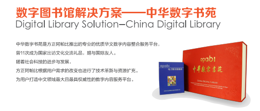 中華數(shù)字書苑是方正阿帕比推出的專業(yè)優(yōu)質(zhì)華文數(shù)字內(nèi)容整合服務(wù)平臺,收錄了建國以來大部分的圖書全文資源、全國各級各類報紙及年鑒、工具書、圖片等特色資源產(chǎn)品,旨在為圖書館、學(xué)校、企業(yè)、政府等客戶及其所屬讀者提供在線閱讀、全文檢索、離線借閱、移動閱讀、下載、打印等數(shù)字內(nèi)容和知識服務(wù)。